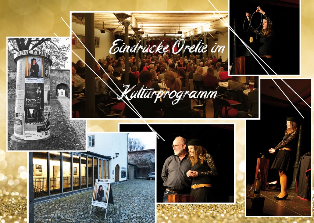 Annette Lanzinger ist Orelié und zaubert auf Ihrer privaten Feierlichkeit entlang der zauberhaften Städte an der B12 von Altötting und Mühldorf bis nach Waldkraiburg oder mit der B15 von Landhut über Dorfen und Haag bis nach Wasserburg und Rosenheim. Verzaubert werden ebenfalls gerne Burghausen, Eggenfelden, Pfarrkirchen, Traunstein, Trostberg und Traunreut. Überregional steht Annette Lanzinger gerne als Orelié mit Ihrer charmanten Zauberei auf Kleinkunstbühnen oder auf der Bühne bei Ihrem Firmenevent in den Landkreisen Mühldorf, Altötting, Pfarrkirchen, Rottal Inn, Traunstein, Rosenheim bis nach Ebersberg, Erding und rund um München.