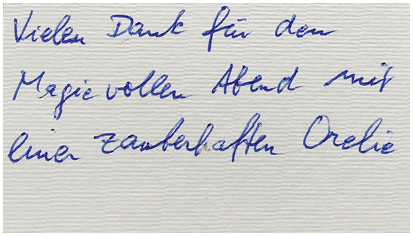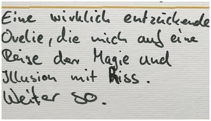 Orélie entführt Sie in die Welt der Magie und noch weiter, denn sie ist mehr als nur Zauberkünstlerin. Ihr Programm “Avignon” vereint Entertainment, Musik, und Magie und das alles mit sehr viel Humor. Sie holt den Zuschauer direkt in der ersten Minute ab und begibt sich mit ihm auf eine magische Reise. Eine Reise zu den Grenzen der Fassungslosigkeit und den Wellen des Staunens. Vorallem aber Tränen des Lachens und der Rührung finden ihren Weg an die Oberfläche, weil man sich selbst so gut wiedererkennt und mit Orélie, dieser Figur voll französischem Charme am liebsten Pferde stehlen möchte. Ihre außergewöhnlich ausgearbeiteten magischen Werke sind eingewoben in spannende Erzählungen und kuriose Handlungen. Mit einer magischen Bewegung lässt sie die Erdanziehungskraft blass aussehen. Auch geheime Gedanken sind vor Orélie nicht sicher, wenn sie ihre lang und hart trainierten mentalen Fähigkeiten nutzt um herauszufinden, was ihr Gegenüber denkt. Dinge werden unsichtbar und verschwinden, um dann an sehr ungewöhnlichen Orten wieder aufzutauchen. Das ist Zauberkunst in einem ganz anderen Kontext. Für Erwachsene, für Träumer, für Realisten – und für die, die ihren magischen Blick aufs Leben neu justieren wollen.