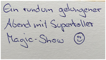 Dieses magische Dinner ist ein Genuss der Unterhaltung in 4 Akten, gepaart mit der kulinarischen Leidenschaft des Veranstalters, denn ein wirklich zauberhaftes Menü in drei Gängen sorgt für Gaumenfreuden. Lassen Sie sich verzaubern!